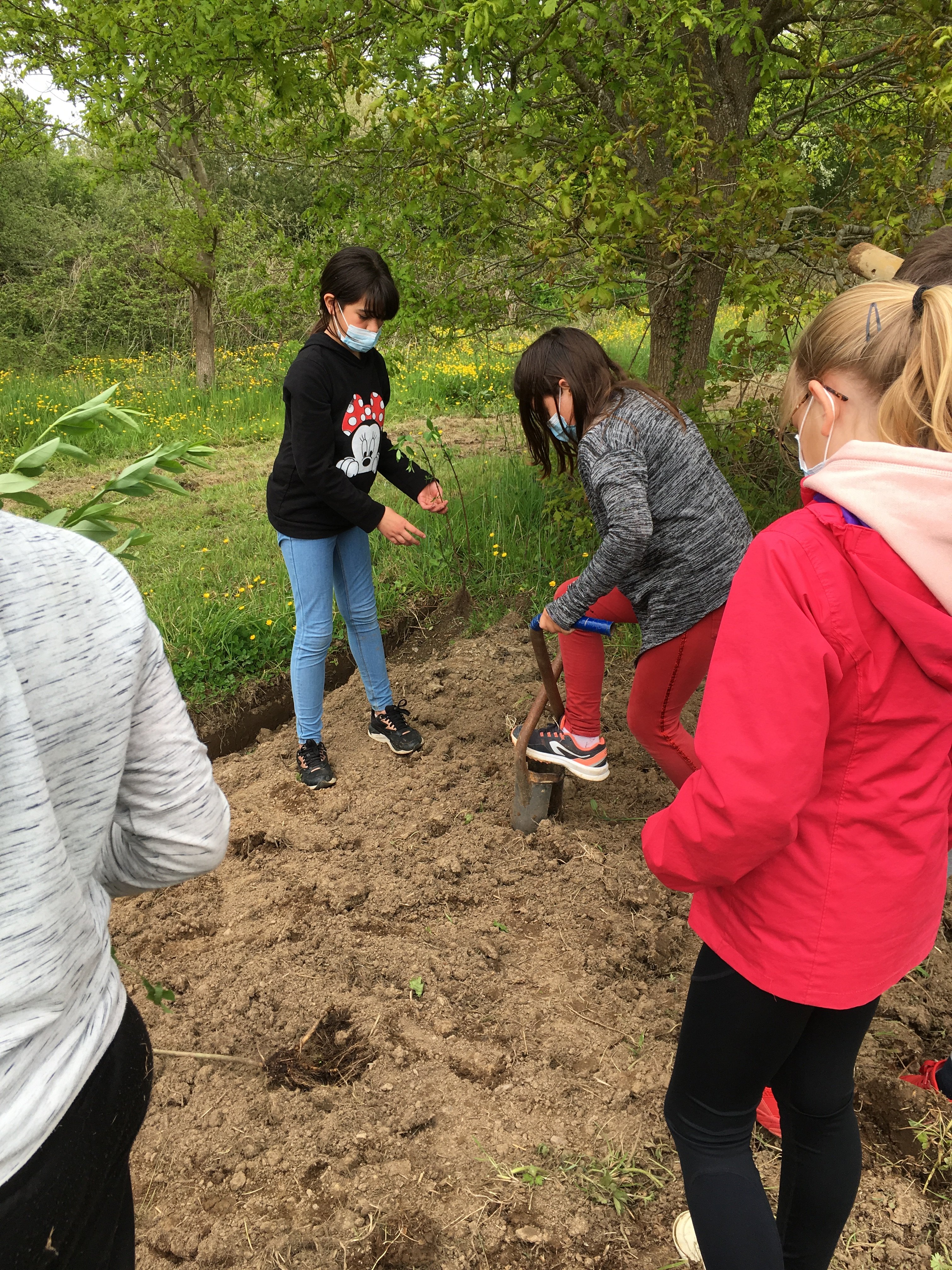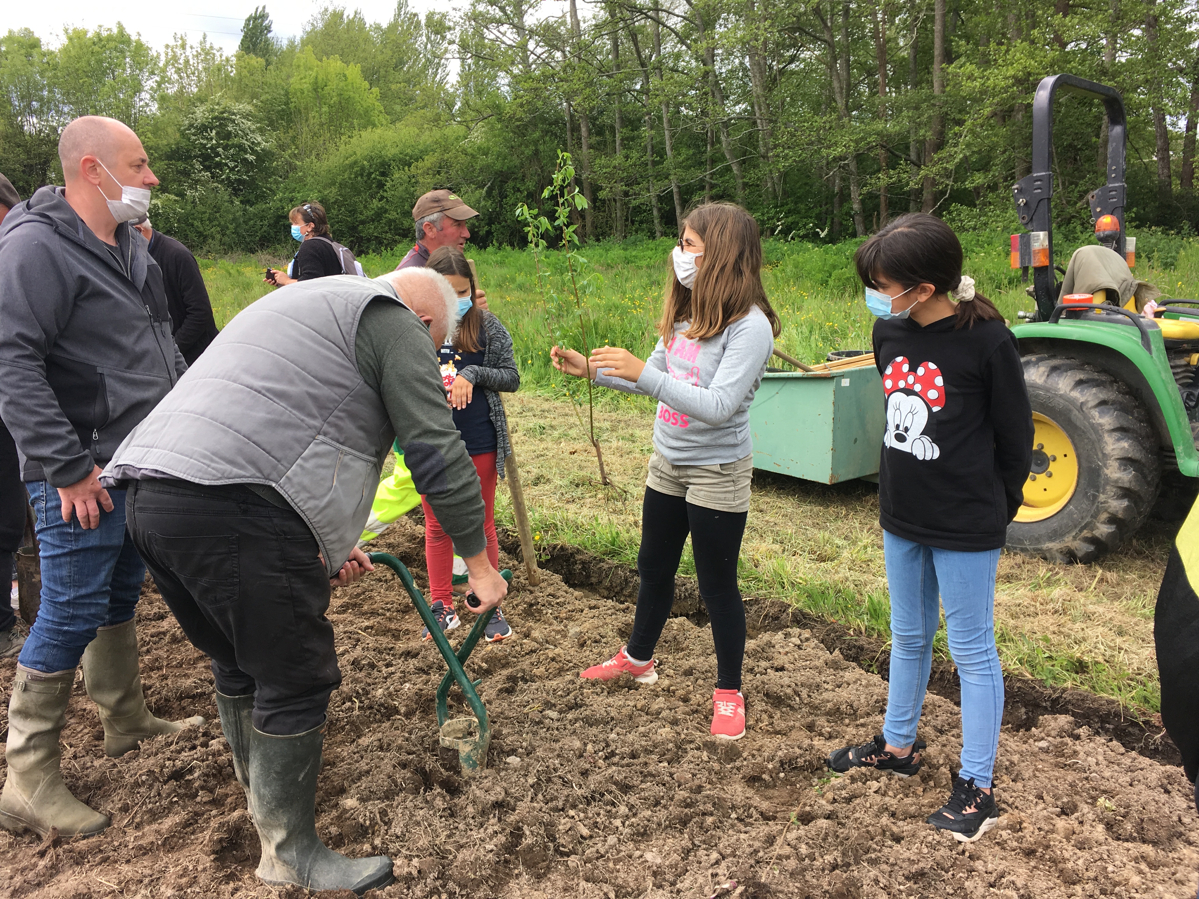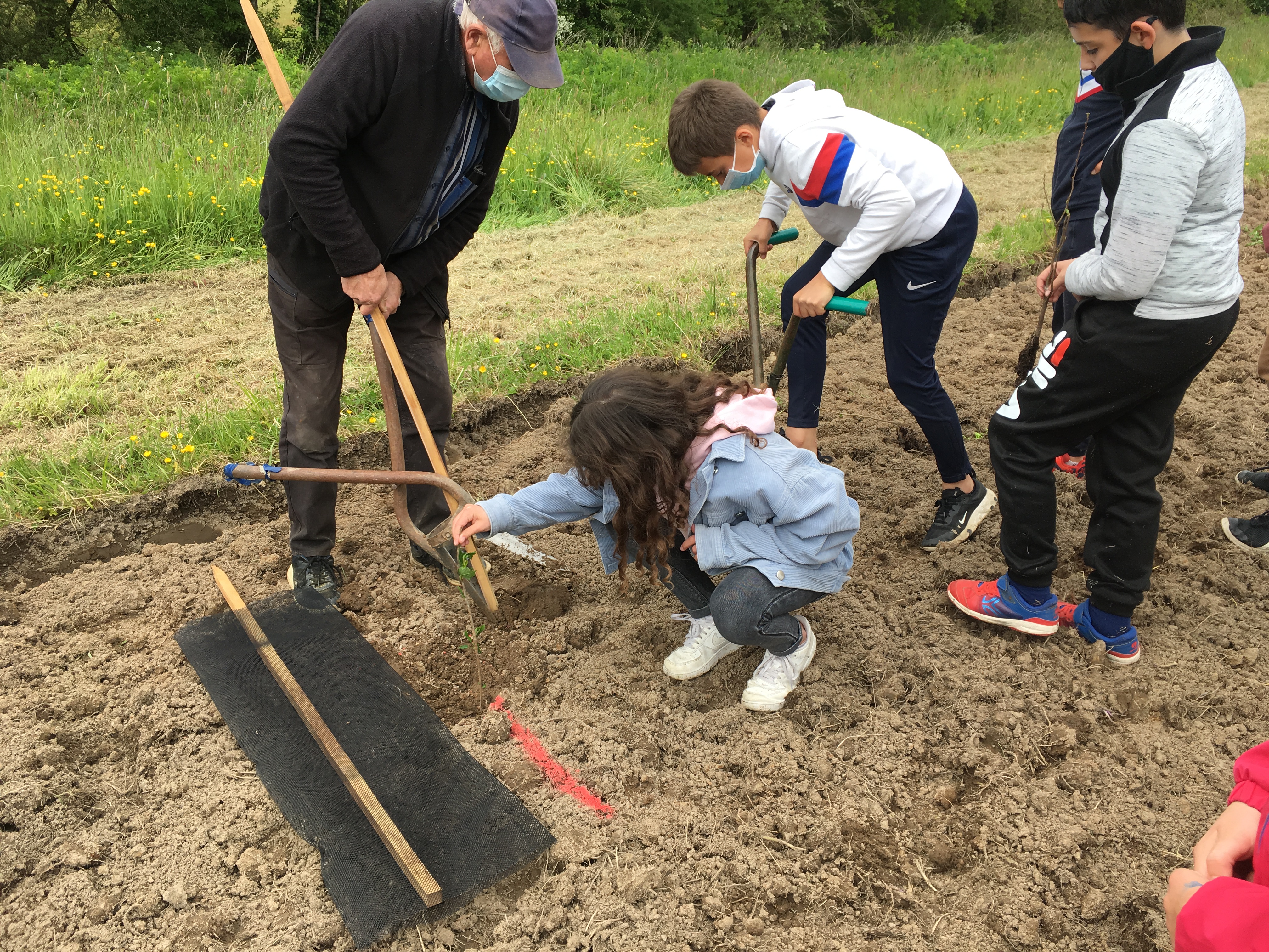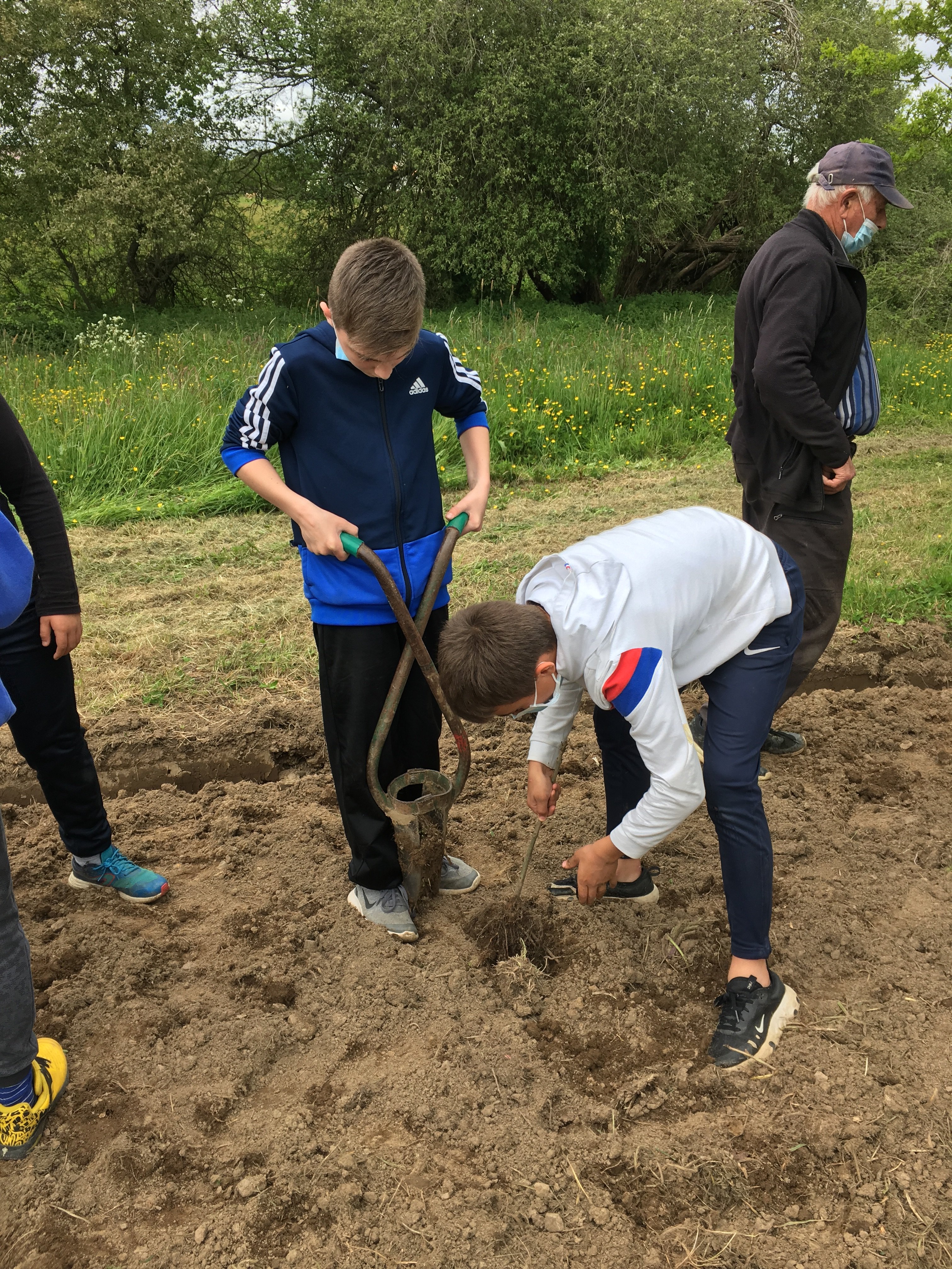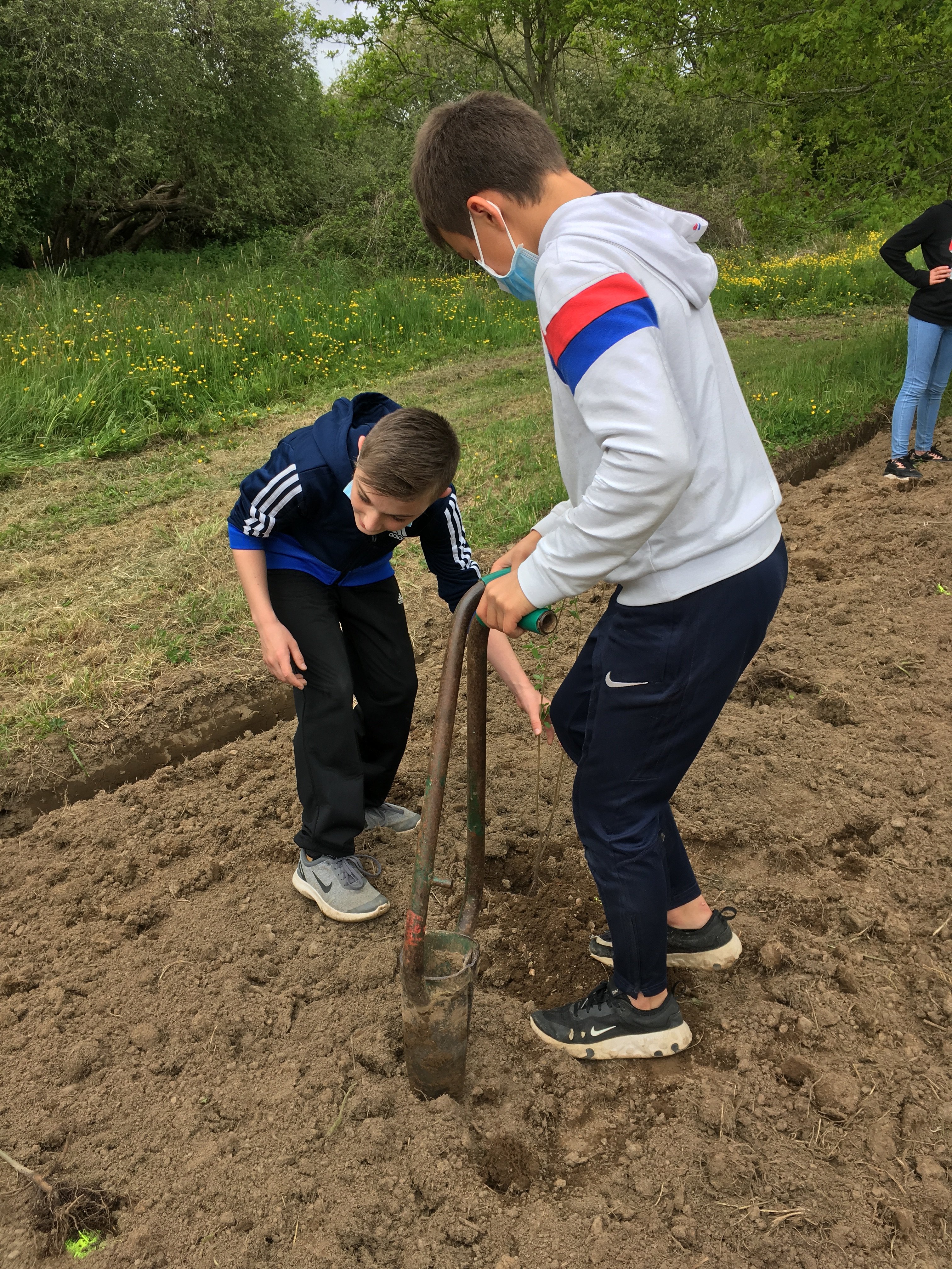 Ils sont allés planter des arbrisseaux. Pour cela, ils ont creusé des trous à l’aide d’une “bicyclette”, ont placé le jeune arbre, puis ont bouché le trou.