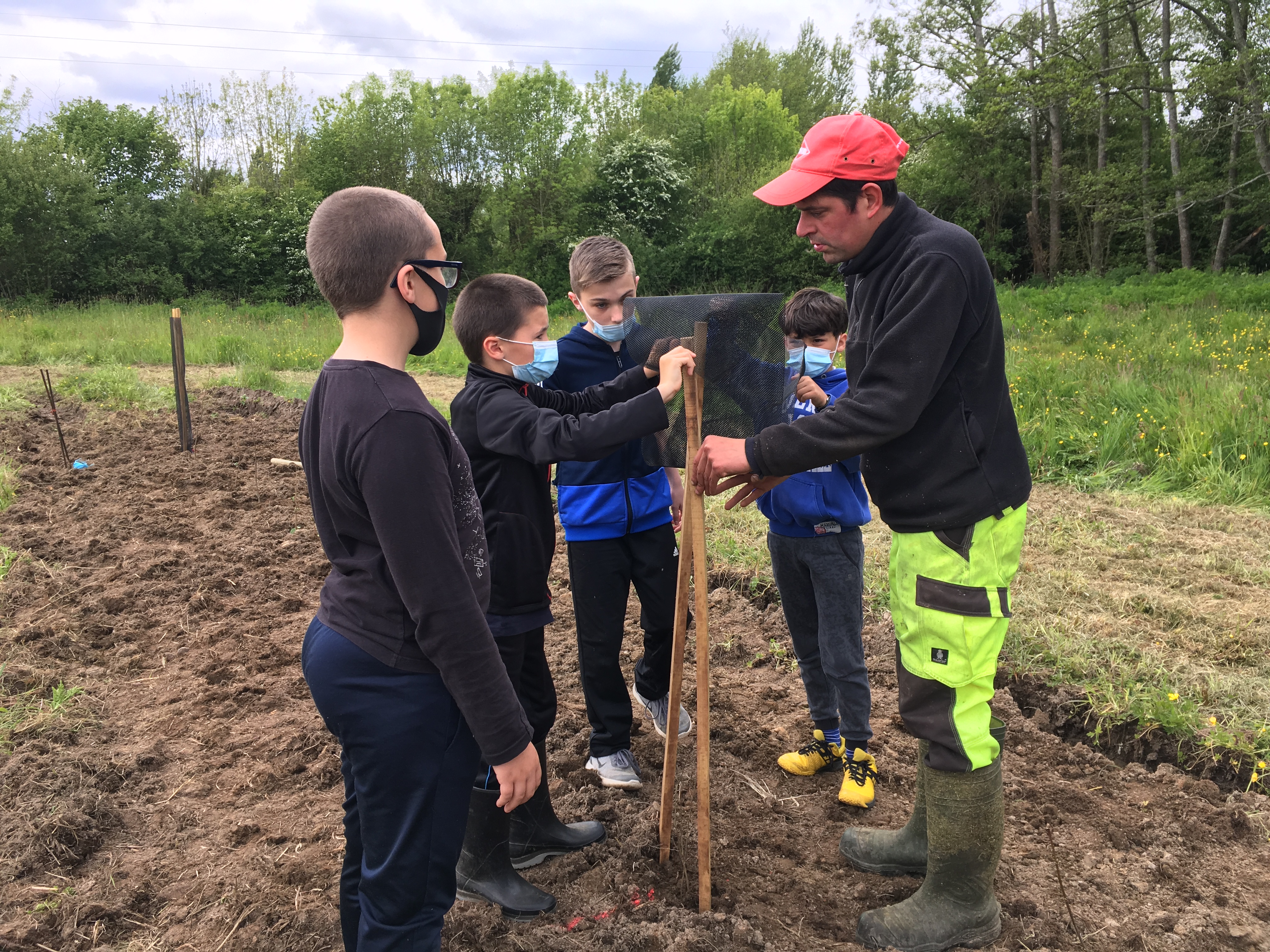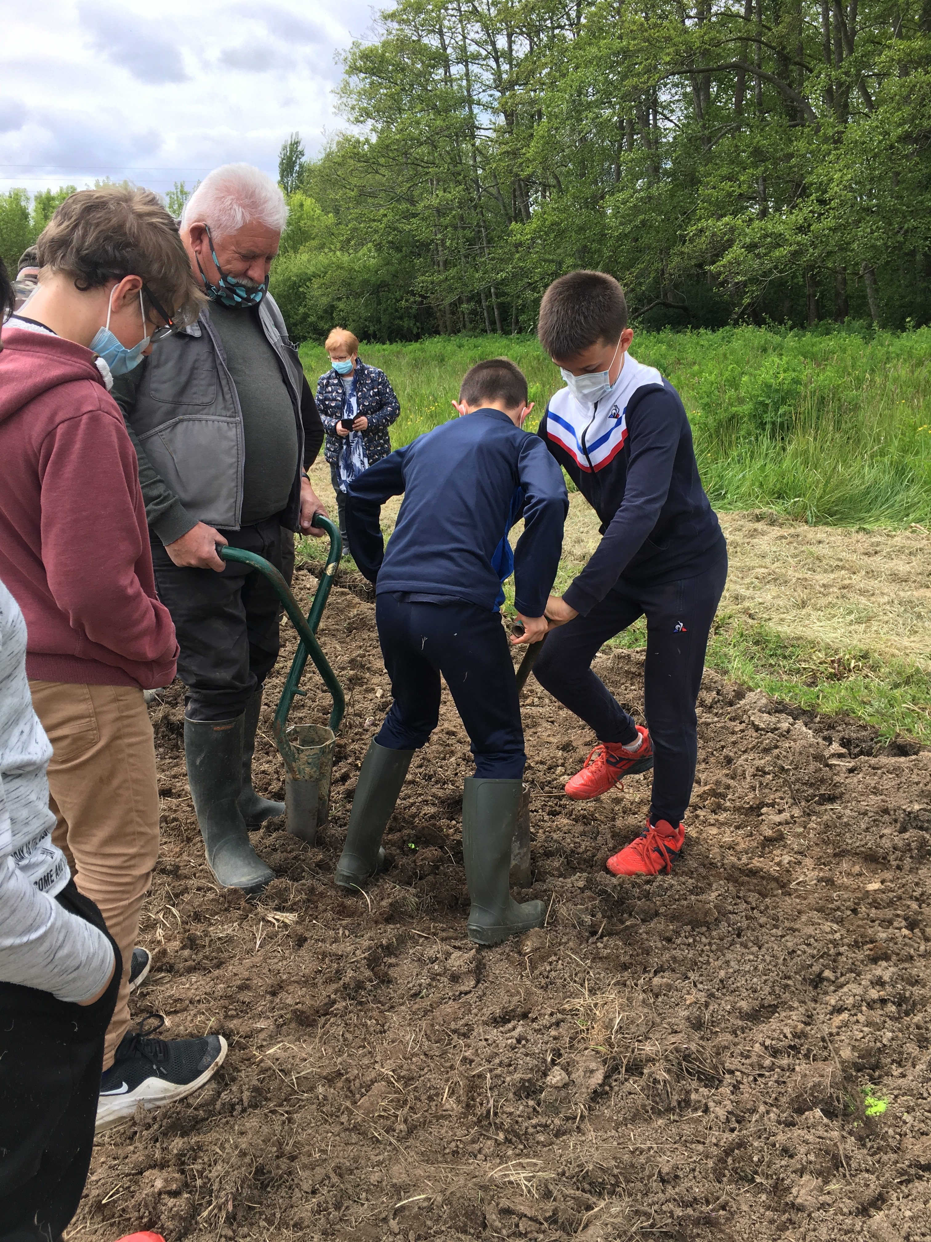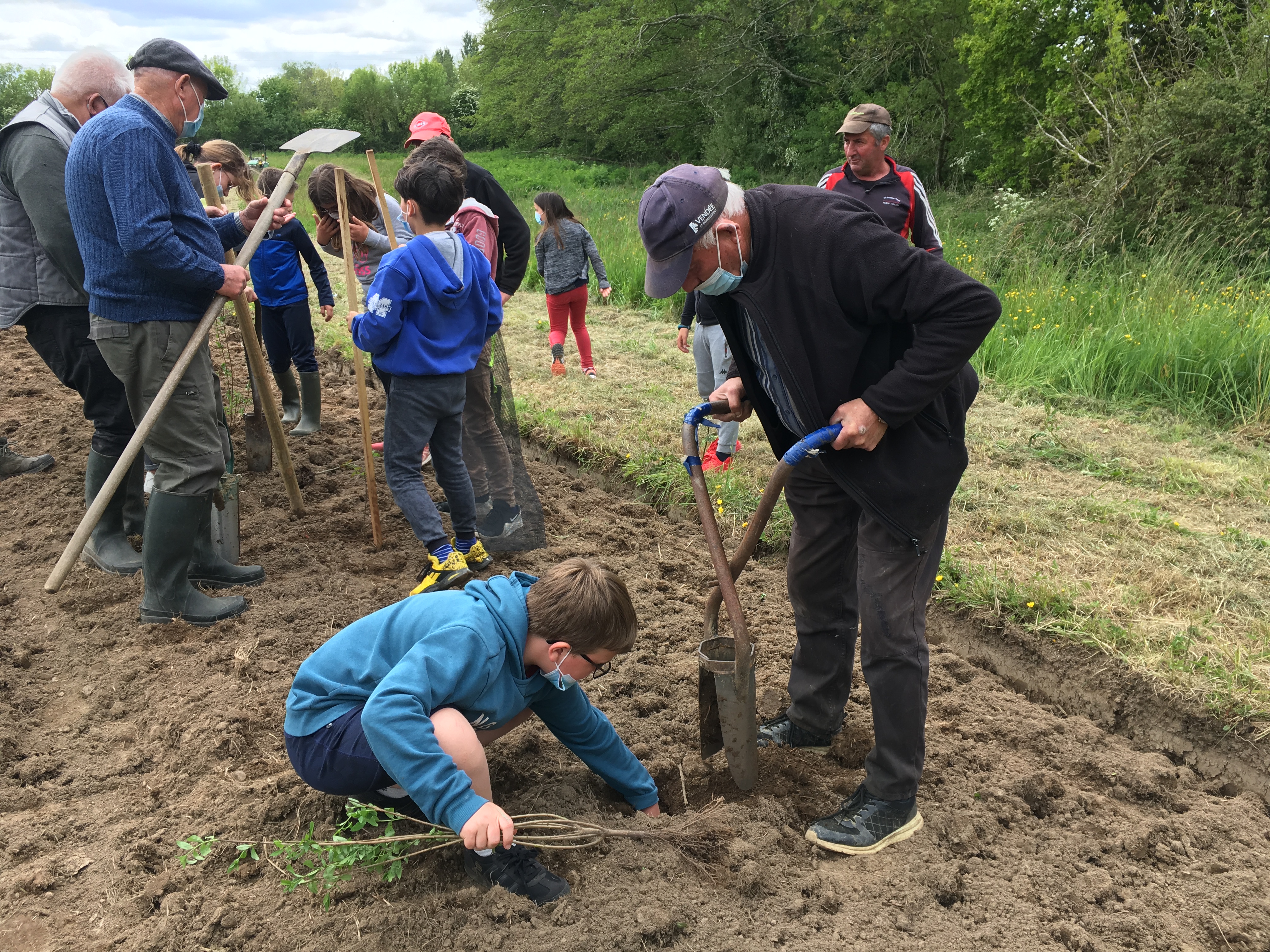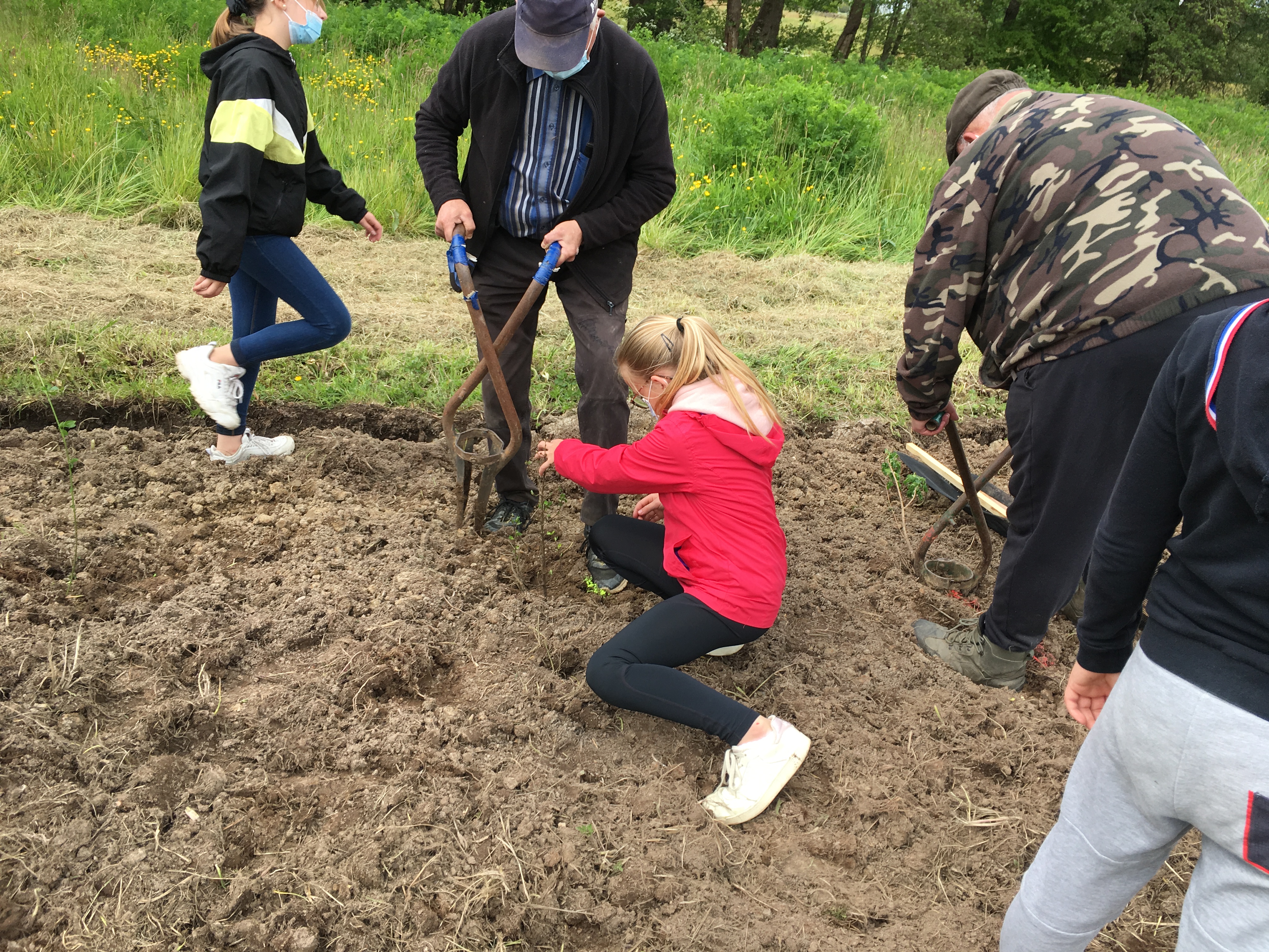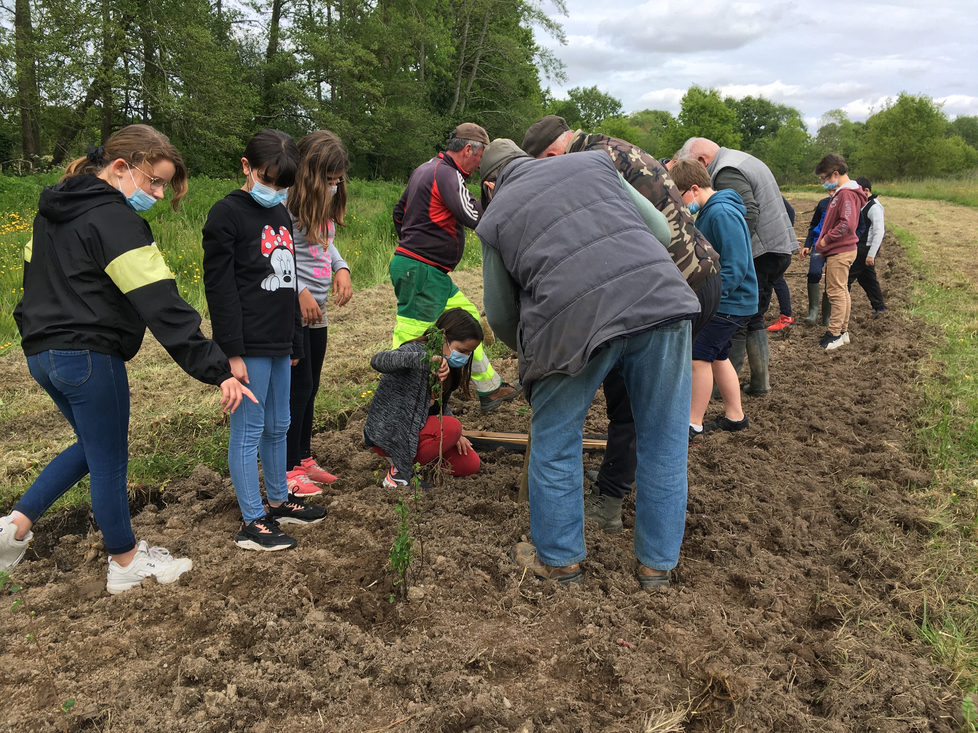 Ils sont allés planter des arbrisseaux. Pour cela, ils ont creusé des trous à l’aide d’une “bicyclette”, ont placé le jeune arbre, puis ont bouché le trou.